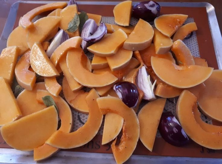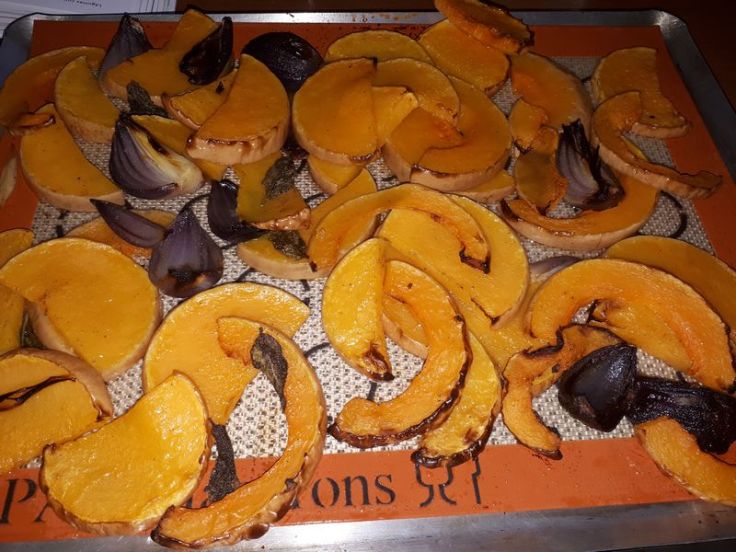 - Nettoyer votre butternut, inutile de l’éplucher, la trancher en tranches de 1 cm d’épaisseur., éplucher et couper les oignons en quartiers de 3 cm de large.