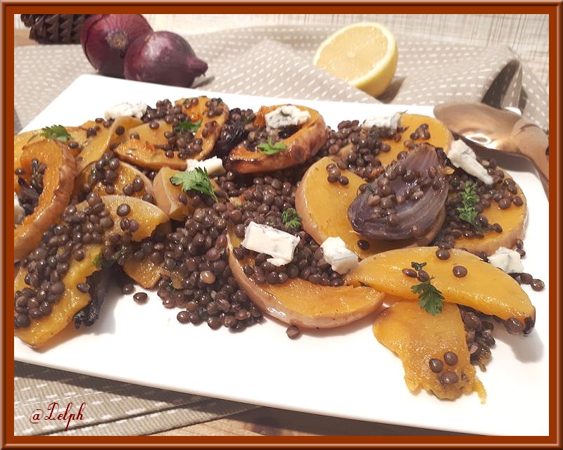 J’adore la combinaison de la courge avec des lentilles et des oignons rouges ! Une excellente idée à tester avant la fin de la saison des courges.