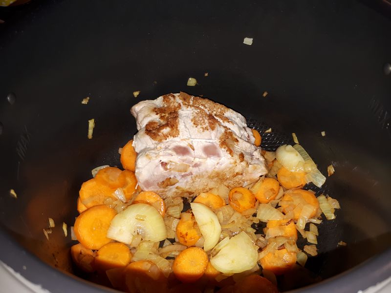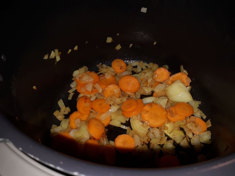 - Programmer le Cookéo en mode dorer, et sans attendre la fin du préchauffage, faire dorer la carotte et l’oignon avec l’huile d’olive, pendant environ 2 minutes, bien mélanger.