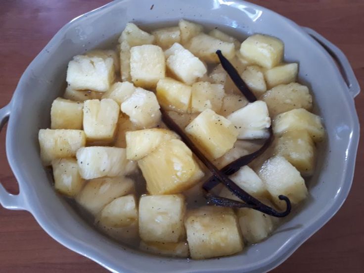 - Verser 20 cl d’eau et le miel dans une casserole, ajouter la gousse de vanille fendue en deux et grattée, porter à frémissements 5 minutes. Ajouter le sachet de thé et laisser infuser 5 minutes hors du feu. Retirer le sachet de thé, verser sur l’ananas, couvrir et placer 1 heure au frais en remuant de temps en temps.