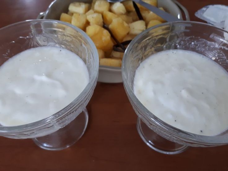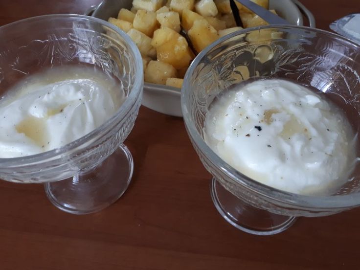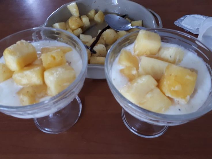 Je me suis inspirée d’une recette trouvée chez ma chère Kekeli. Je vous la propose en version verrine pour le petit déjeuner mais Kekeli vous la décline en dessert donc sans le fromage blanc mais avec une boule de glace. C’est une recette que l’on peut décliner autrement, je pense même préparer un futur ananas de la même façon mais faire un petit crumble avec…Voilà qui est bien en cuisine, on peut cuisiner à l’infini et ne jamais s’ennuyer.
