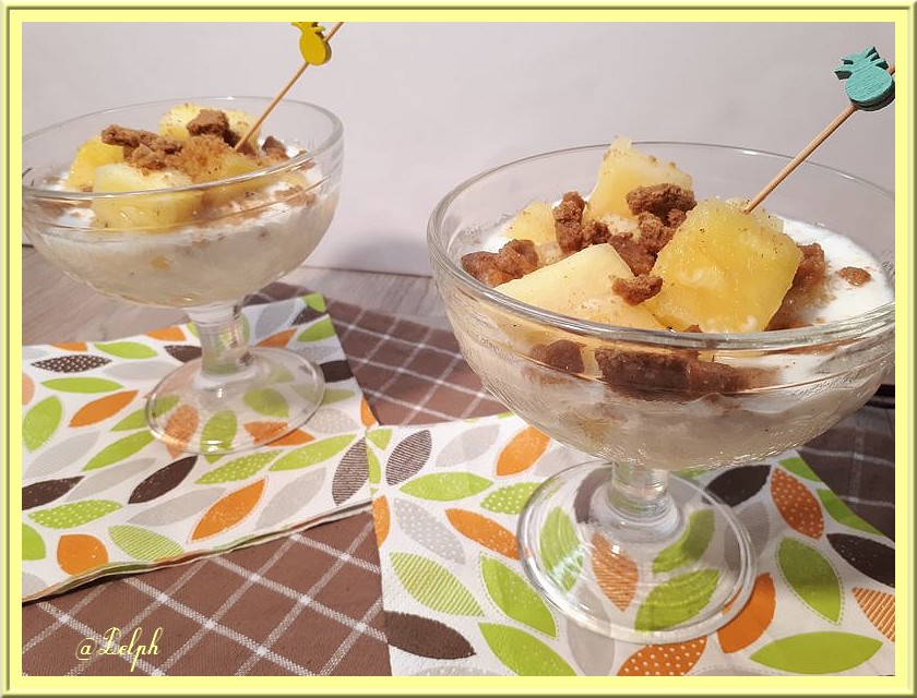 Je me suis inspirée d’une recette trouvée chez ma chère Kekeli. Je vous la propose en version verrine pour le petit déjeuner mais Kekeli vous la décline en dessert donc sans le fromage blanc mais avec une boule de glace. C’est une recette que l’on peut décliner autrement, je pense même préparer un futur ananas de la même façon mais faire un petit crumble avec…Voilà qui est bien en cuisine, on peut cuisiner à l’infini et ne jamais s’ennuyer.