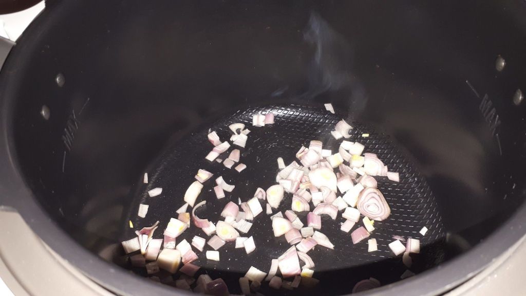 - Mettre le cookéo en mode dorer, dès le milieu du préchauffage déposer un filet d’huile d’olive dans votre cuve. Ajouter les échalotes épluchées et ciselées, dorer 1 minutes.