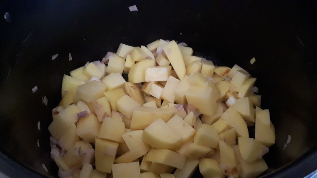 - Éplucher et laver les pommes de terre, les couper en dés, les ajouter aux échalotes et faire dorer 4 minutes, en mélangeant régulièrement.