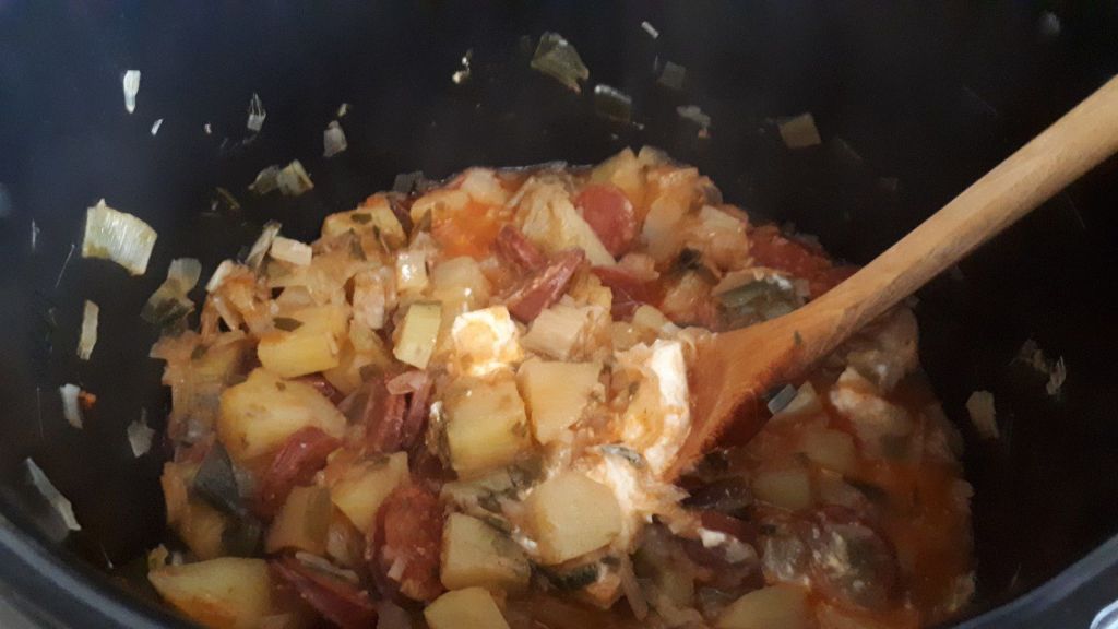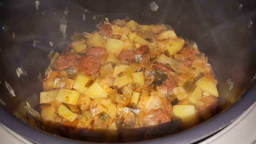 Voici un petit repas, facile et rapide à préparer, avec un reste de chorizo, des poireaux, quelques pommes de terre et hop le repas est prêt. Je l’ai réalisé avec mon Cookéo mais vous pourrez le faire à la sauteuse, cela prendra un peu plus de temps.