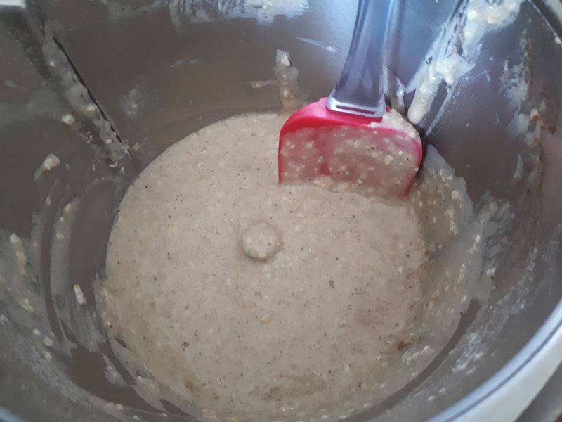 - Mettre les bananes coupées en morceaux dans le bol et mettre en purée 20 sec/Vit3, ajouter le lait, l’huile, l’œuf et l’extrait de vanille et mélanger 20sec/vit3, ajouter la farine, les flocons d’avoine, le sucre, la levure chimique, la cannelle et le sel et mélanger 20sec/couteau inversé/vit4.