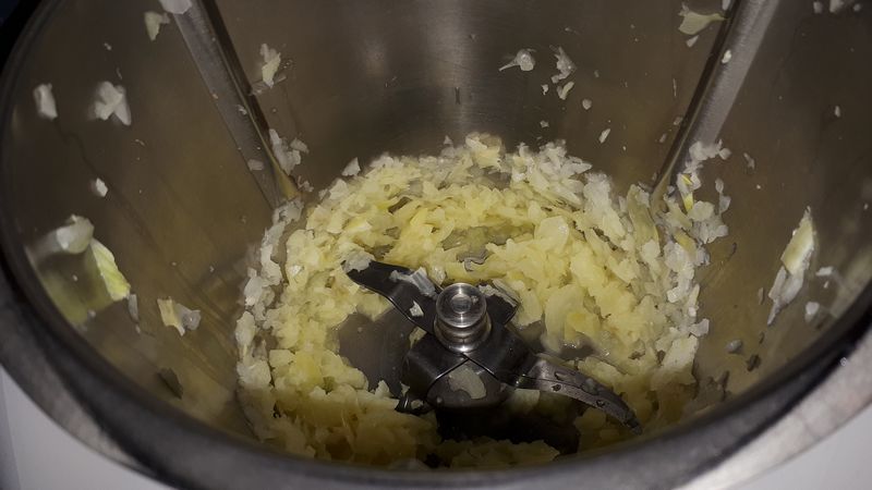 - Éplucher et couper les oignons en deux les mettre dans le Thermomix et mixer 5sec/vit5, ajouter l’huile d’olive et faire revenir 3min/120°C/Vit1.
