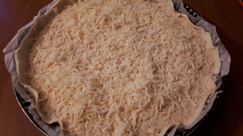 - Verser le tout sur le fond de tarte, parsemer d’emmental et mettre au four pendant 40 minutes.