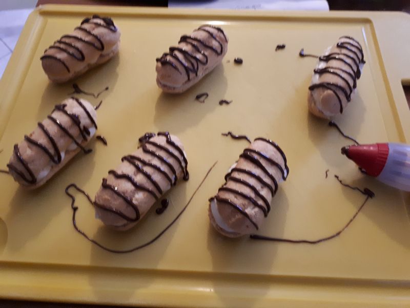 2. Mettre votre chantilly dans une poche à douille, avec une petite douille dentelée, puis fourrer vos éclairs et vos cornets.