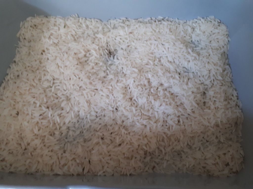 - Dans un plat à four, verser le riz et mélanger le thym et du poivre.