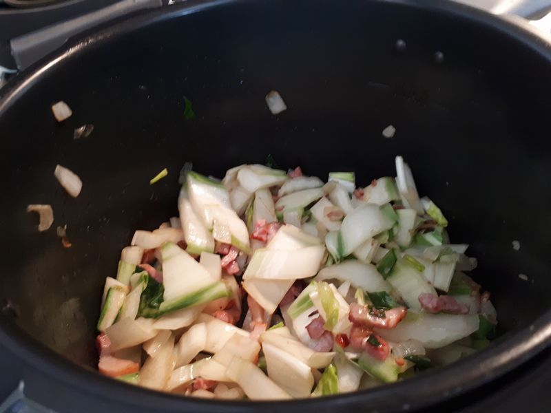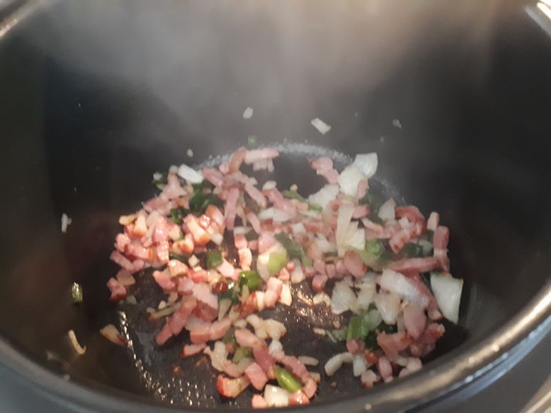 - Mettre le Cookéo en moder dorer et déposer dans la cuve, les lardons, l’oignon avec le vert, mélanger et laisser dorer 1 minute.
