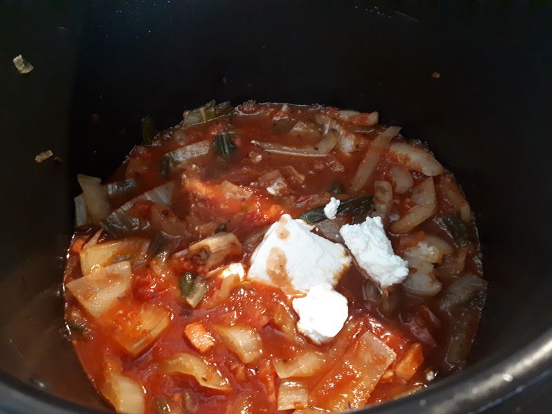 - Incorporer la pulpe de tomates, les herbes, le basilic, un peu de sel, du poivre, le bouillon et passer en mode sous pression pour 10 minutes.