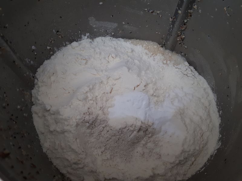 - Ajouter les farines, le bicarbonate et le sel. Pétrir 2 minutes / fonction épi : la pâte est collante, c’est normal.