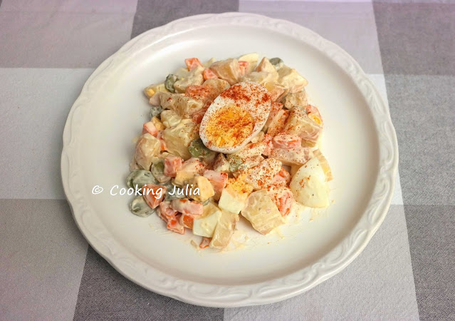 Voici notre charmante Isabelle du superbe blog "Cooking Julia" qui a testé la salade de pommes de terre à la Tchèque, recette que j'avais réalisée dans le cadre de mon tour du monde culinaire.Cette recette lui a fait penser à la salade piémontaise, à la différence que le jambon de cette dernière est remplacé par de la carotte. Cela donne une salade nourrissante, à base d'ingrédients bon marché et faciles à trouver.