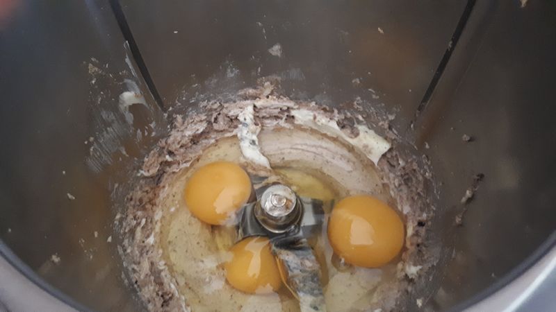 1. Déposer dans le bol du Thermomix le beurre ramolli avec le sucre et mélanger 40sec/vit4. Ajouter les œufs puis mélanger 20sec/vit3.