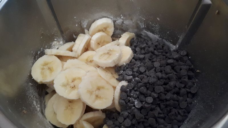 3. Couper les bananes en petits morceaux et les ajouter avec les pépites de chocolat dans le bol et mélanger 20sec/couteau inversé/vit3. Racler et mélanger 10sec/couteau inversé/vit3.