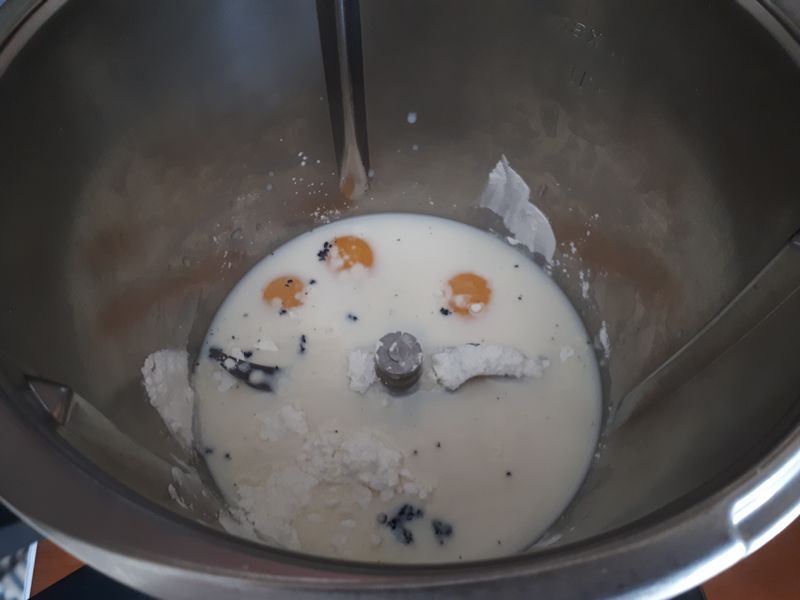 - Gratter votre gousse de vanille, mettre le lait, les graines de la gousse, les jaunes, le sucre et la fécule dans le bol puis faire chauffer 8min/90°C/vit3.