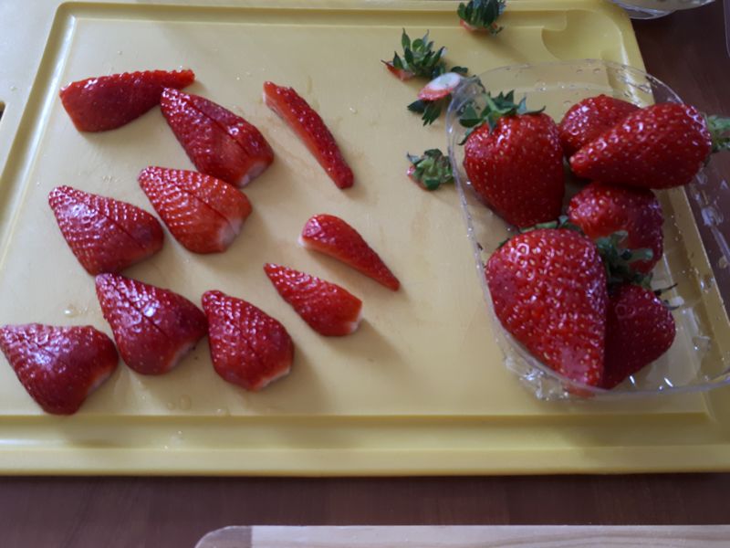 - Rincer les fraises, les équeuter puis les couper en 2, les disposer harmonieusement sur la crème.