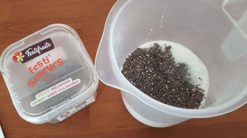 - Dans un bol, mélanger le lait d’amande, les graines de chia. Le mélange va gonfler en quelques minutes.
