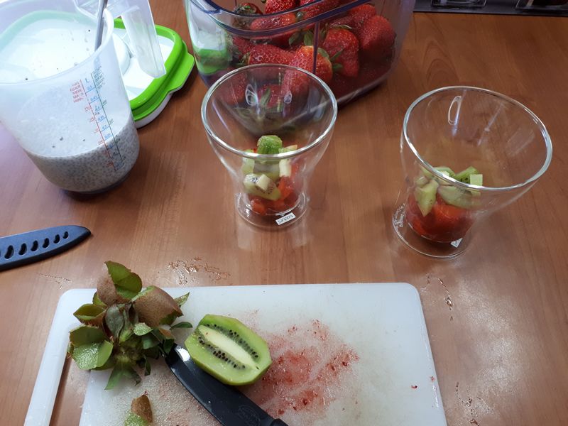 - Laver et couper les fraises en dés, éplucher et couper votre kiwi en dés puis les répartir dans vos verres. (Garder quelques fraises et des tranches de Kiwi pour le topping)