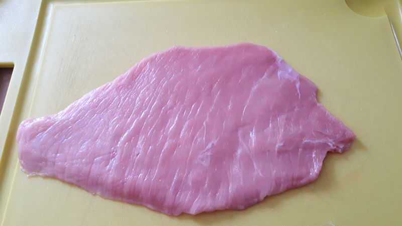 - Sur l’escalope, déposer une tranche de jambon puis le cheddar sur un côté.