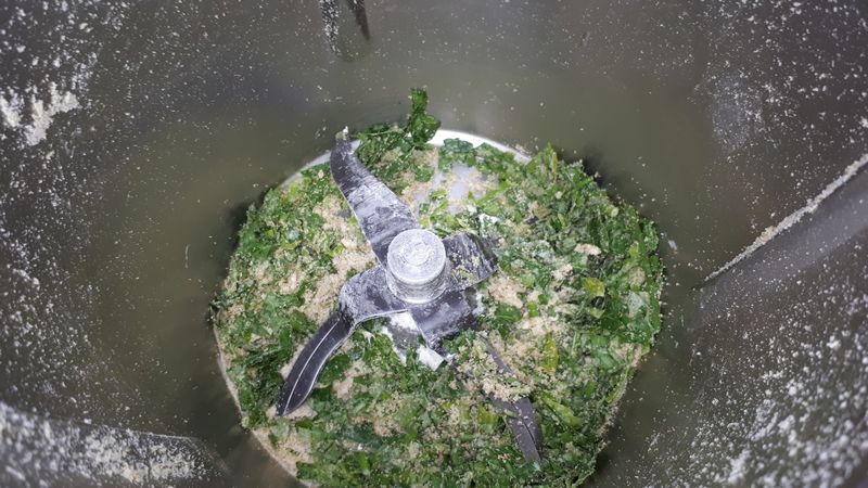 - Ajouter la farine, 5 g d’huile d’olive,le basilic, la ciboulette et le persil et mixer 10sec/Vit3. Transvaser le crumble dans un récipient et réserver.