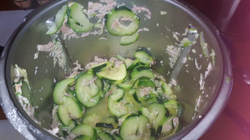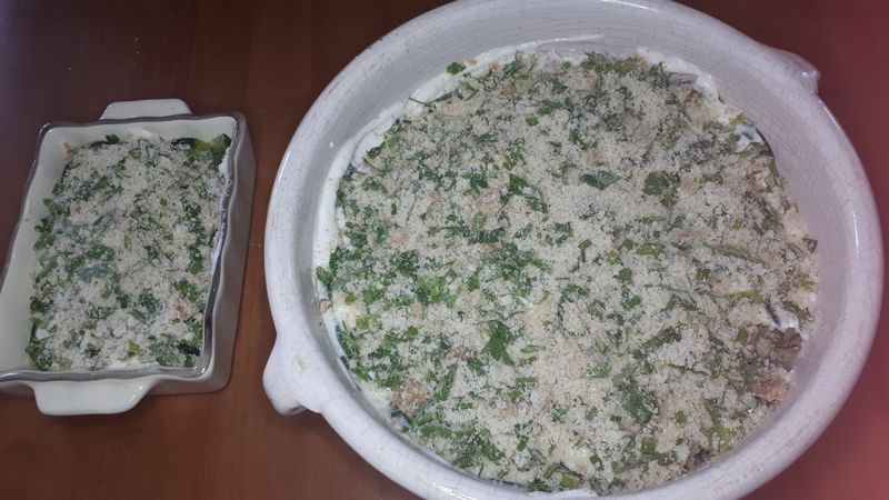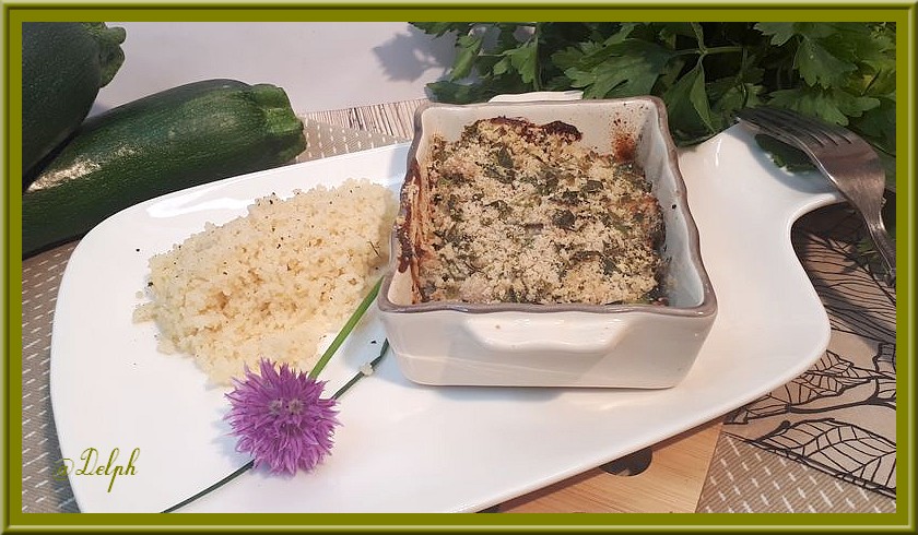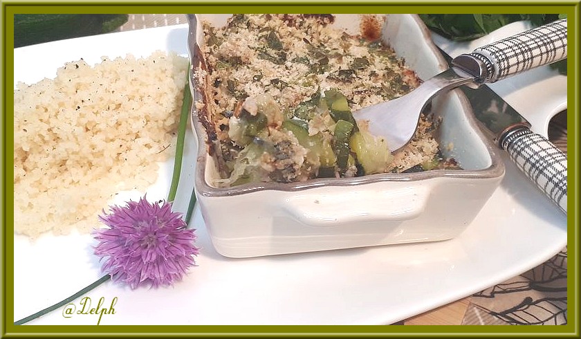 - Mettre l’huile d’olive, la ricotta, les cuillères du bouillon rendu par les courgettes, le sel et le poivre dans un saladier et mélanger le tout. Napper les courgettes et le bacon de cette sauce, répartir le crumble sur les courgettes et enfourner 15 minutes à 180°C, j’ai ajouté 5 minutes à 200°C, pour que cela soit un peu plus doré.