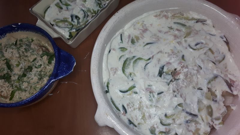 - Garder le jus de cuisson des courgettes dans un bol ( vous vous en servirez pour la sauce) et transvaser les courgettes et le bacon dans un plat à gratin et réserver.