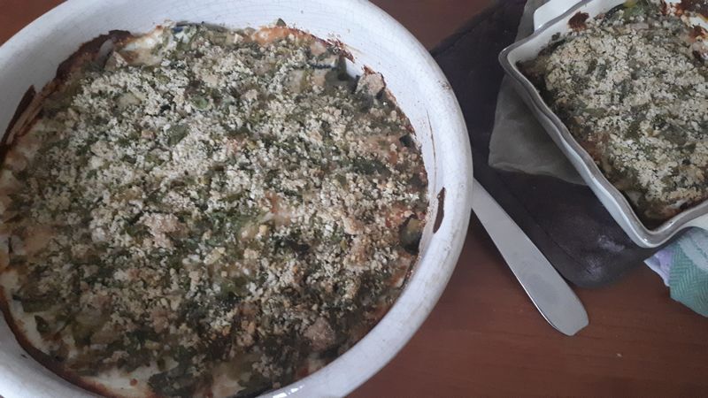 - Mettre l’huile d’olive, la ricotta, 4 cuillères à soupe du jus de cuisson des courgettes, le sel et le poivre et mixer 10sec/vit3. Napper les courgettes et le bacon de cette sauce, répartir le crumble sur les courgettes et enfourner 15 minutes à 180°C, j’ai ajouté 5 minutes à 200°C, pour que cela soit un peu plus doré.