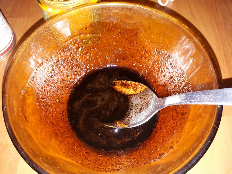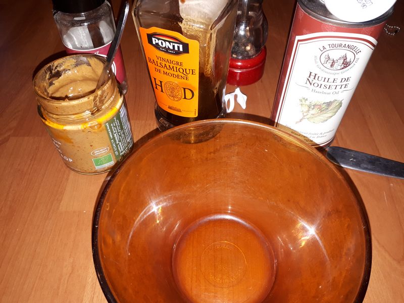 - Préparer la vinaigrette, mélanger le sel, le poivre, moutarde, vinaigre et huile. Réserver.