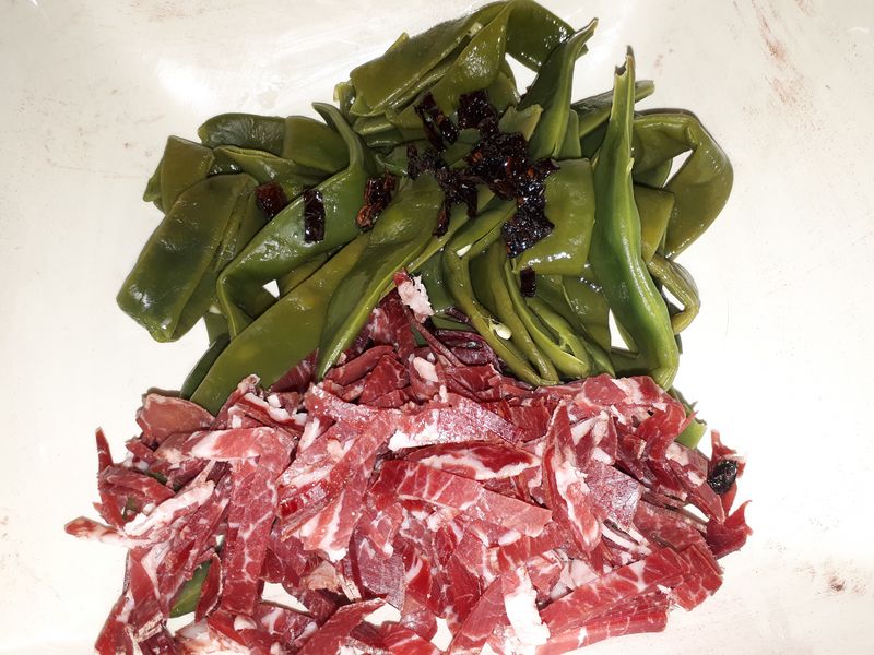 - Couper la coppa en lanières, détailler les pétales de tomates en petits bouts. Mélanger le tout aux haricots égouttés.
