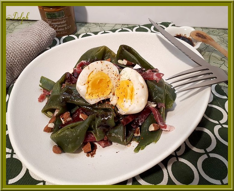 - Dresser vos assiettes, parsemer d’amandes grossièrement concassées, déposer votre œuf dur sur le dessus coupé en deux, assaisonner avec la vinaigrette et une pincée de piment d’Espelette.