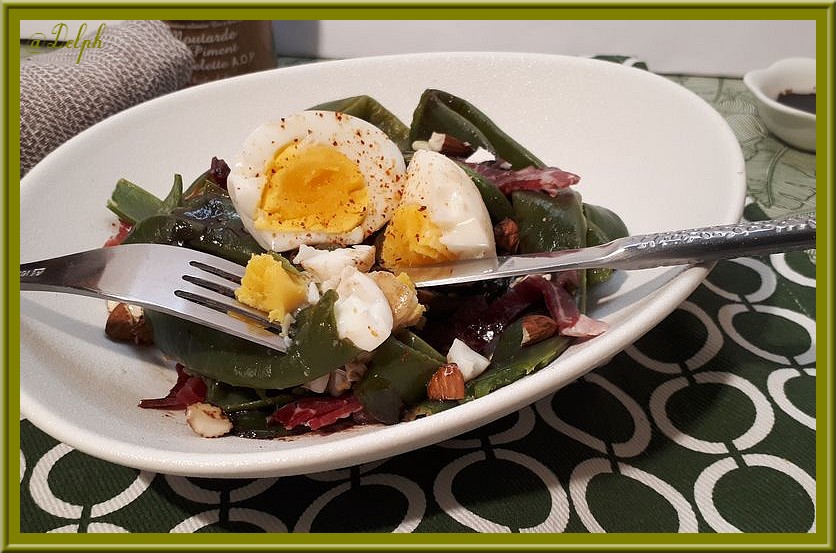 Voici une salade qui change un peu avec des haricots plats, j’ai fait aussi des œufs durs pour qu’elle soit bien complète, nous nous sommes régalés.