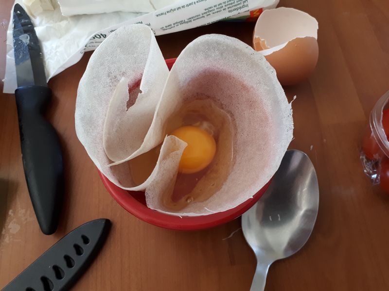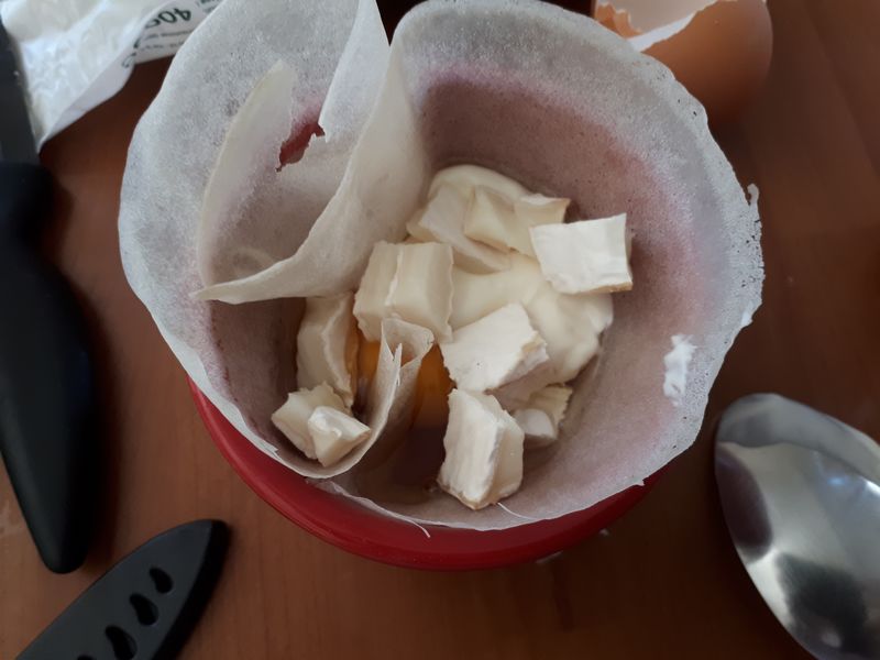 - Beurrer l’intérieur de votre ramequin. Plier votre feuille de brick en deux et placer la délicatement à l’intérieur.