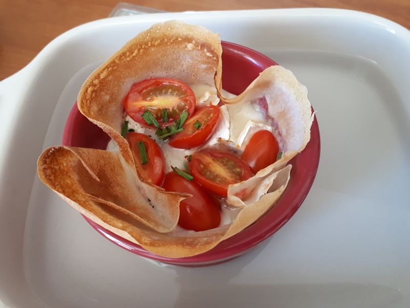 - Déposer vos ramequins au centre d’un grand plat que vous aurez préalablement rempli d’eau chaude, puis enfournez-le dans votre four bien chaud et laisser cuire au bain-marie 8 à 9 minutes, jusqu’à ce que le blanc de l’œuf soit cuit et la feuille de brick dorée.