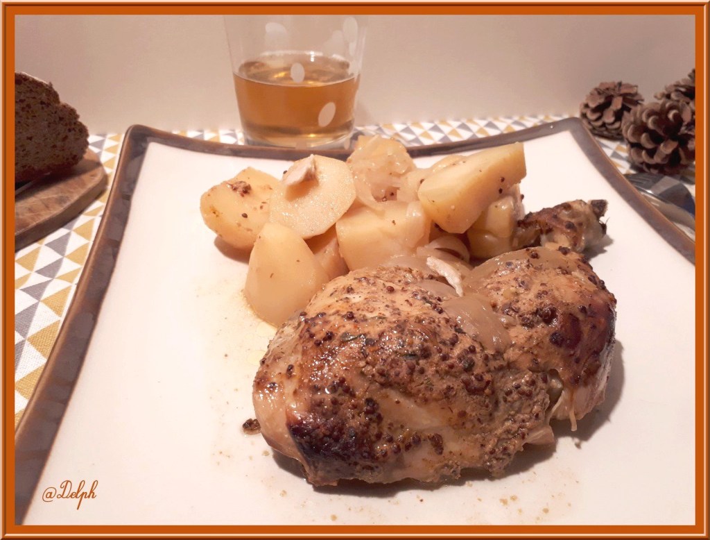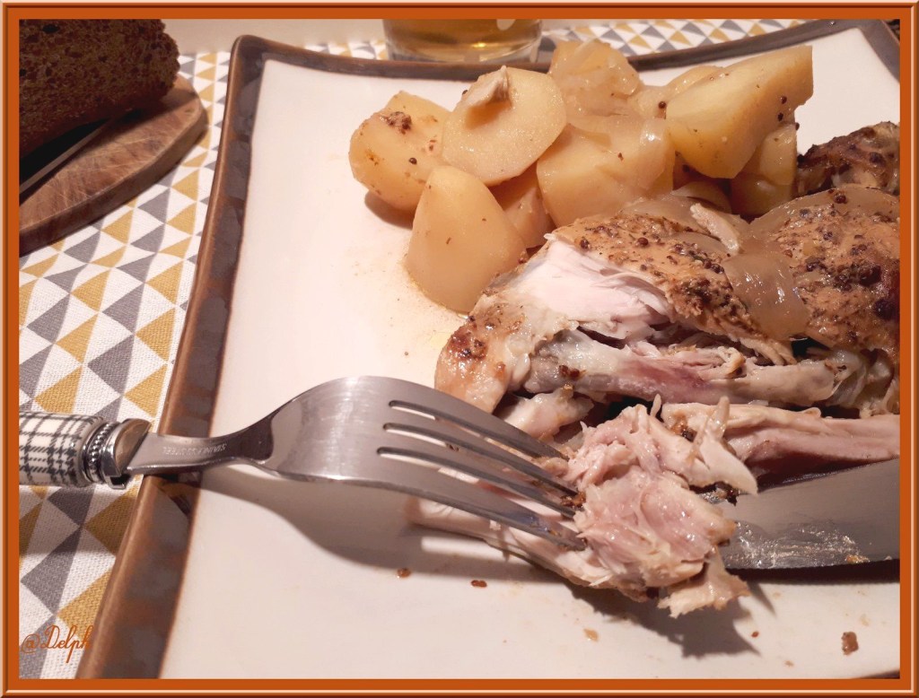 Voici une recette que j’ai piochée chez Julie, j’ai trouvé cette recette très pratique car la cuisson du poulet se fait au four, pendant que cela cuit tranquillement on peut vaquer à d’autres occupations. Julie a mis des carottes et des champignons, mais j’ai fait ce plat pour mes hommes donc je me suis limitée aux oignons et pommes de terre.