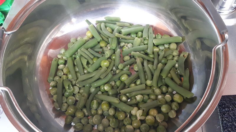 - Écosser vos petits pois, équeuter et laver vos haricot les couper en 3 ou 4 selon leur grandeur, les faire cuire à la vapeur.