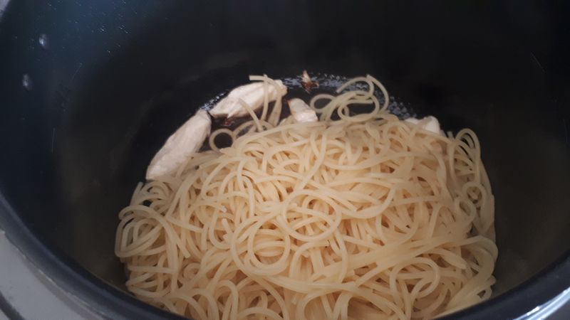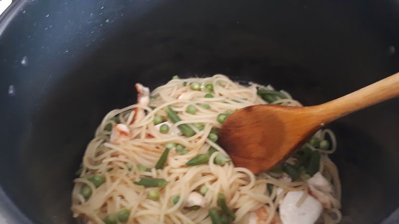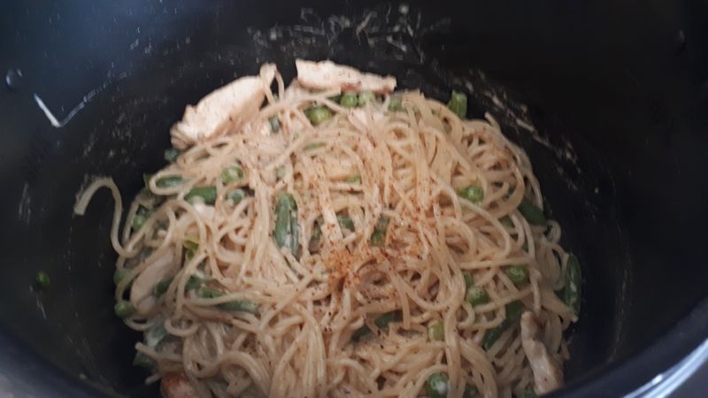 - Passer en mode dorer, mettre le beurre, détailler vos filets de poulet en aiguillettes, les déposer dans la cuve sur le beurre fondu, faire dorer 1 minute de chaque côté, ajouter vos légumes verts, les spaghetti égouttées, mélanger le tout, puis ajouter la crème mélangée à la moutarde, laisser environ 1 minute tout en remuant pour que la crème s’enrobe bien aux légumes. Assaisonner à votre goût.