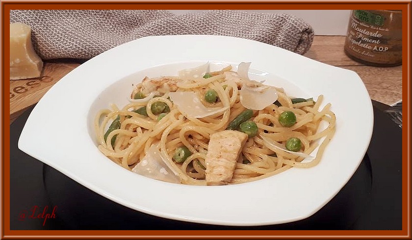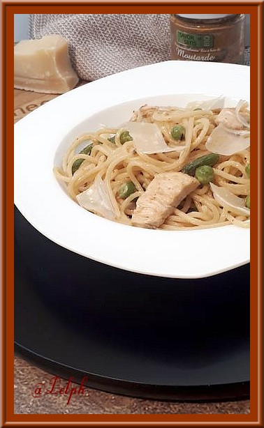 - Lorsque votre viande est cuite, ajouter vos légumes verts, les spaghetti égouttées, mélanger le tout, puis ajouter la crème mélangée à la moutarde. Mélanger, assaisonner.