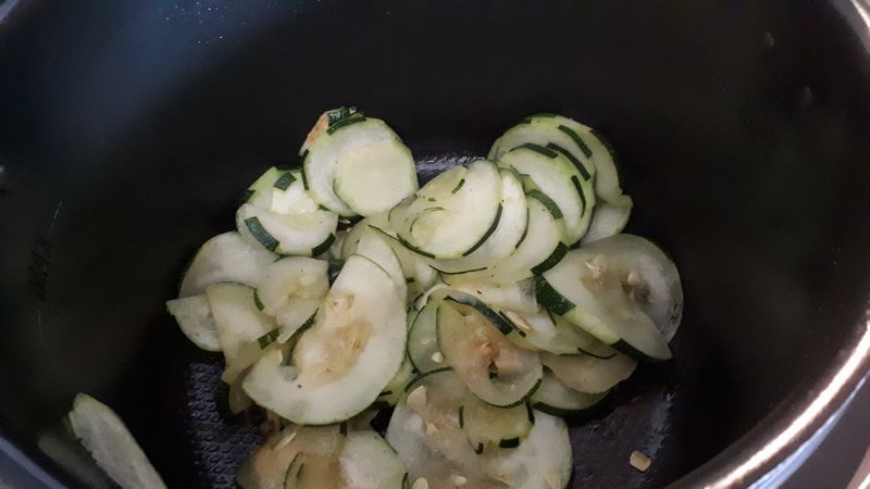 1. Émincer les courgettes, les faire revenir 5 minutes avec l’huile d’olive sans les laisser colorer. Saler et poivrer.