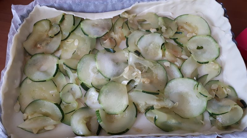 2. Abaisser votre pâte, la piquer avec une fourchette, disposer vos courgettes égouttées sur le fond.