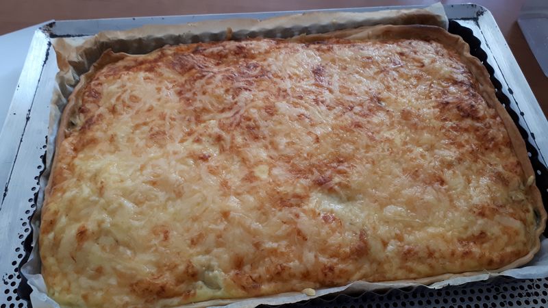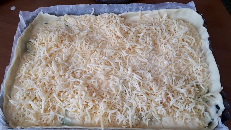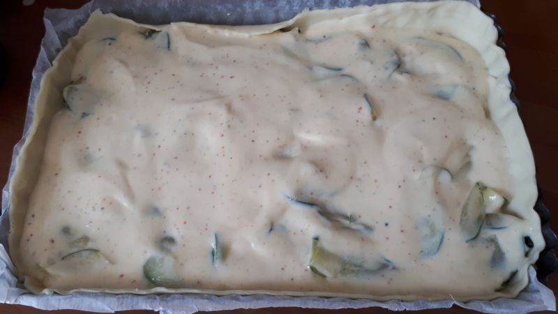 5. Verser votre appareil à quiche sur les courgettes, parsemer d’emmental râpé.