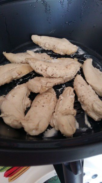 - Dans le bol, mettre l’eau et un peu de sel. Puis placer le Varoma avec le poulet et programmer 20 mn / varoma / vitesse 1.