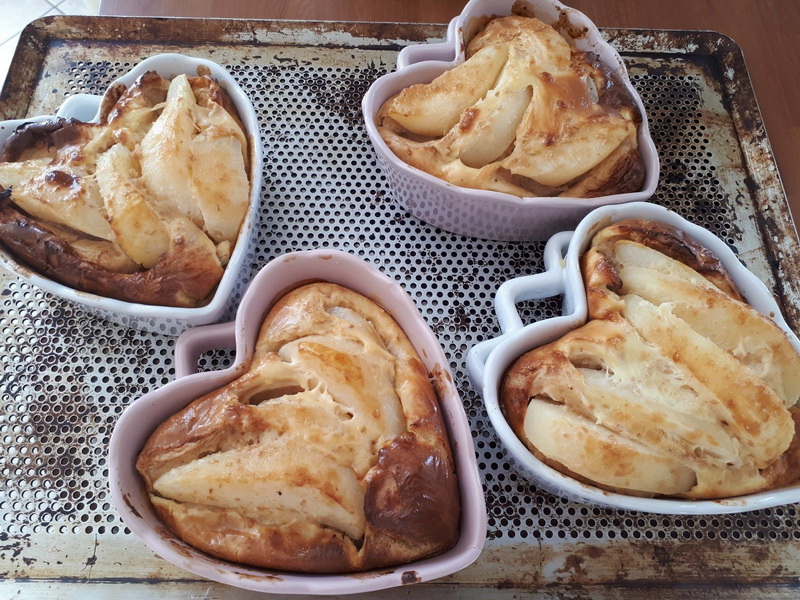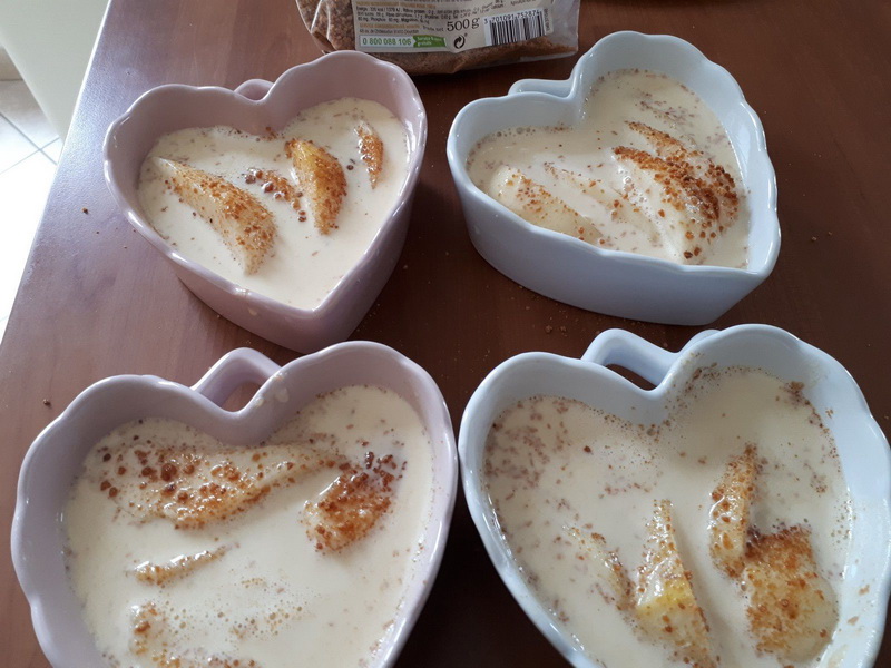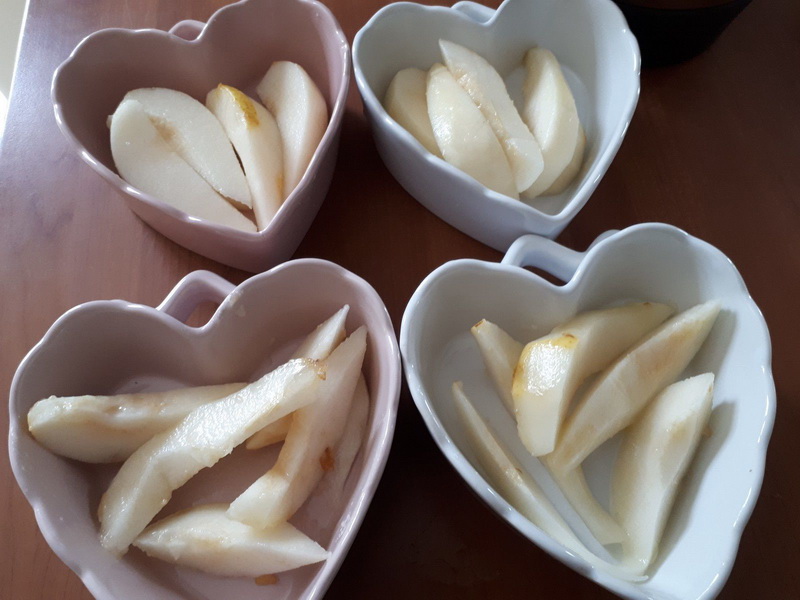 - Éplucher vos poires et les couper en lamelles, les déposer dans vos ramequins (environ 1/2 poires par ramequin).