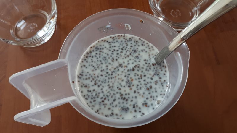 - Dans un bol mélanger le lait avec les graines de chia, laissez reposer 30 minutes, mélanger de nouveau, puis répartir la préparation dans des verrines.