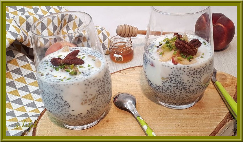 J’aime beaucoup diversifier mes petits déjeuner alors je me suis préparée un nouveau pudding. Pour faire le plein de vitamines c’est parfait. Pour le topping j’ai utilisé une pêche et des fruits secs, mais vous pouvez opter pour des fruits rouges ou autre selon les fruits de saison et de vos envies.