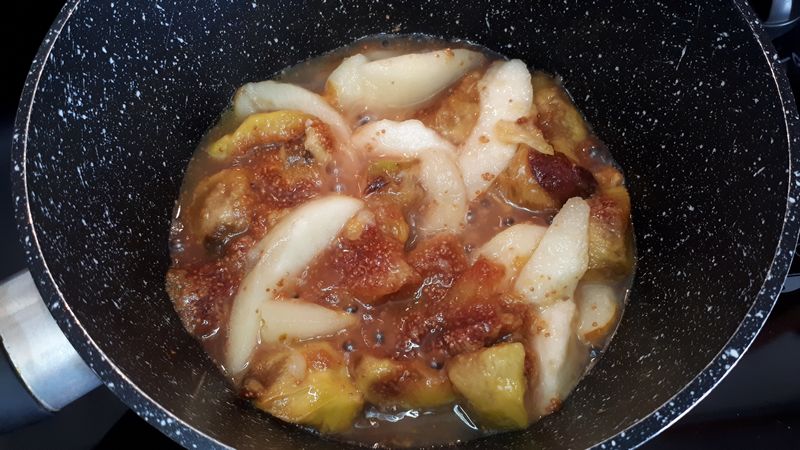- Éplucher et couper votre poire en morceaux, faire pareil avec les figues, mettre le tout dans une casserole avec la noix de beurre, les faire cuire à feu moyen 5 bonnes minutes, les morceaux doivent être fondants. Parsemer d’une pincée de cannelle et réserver au frais.