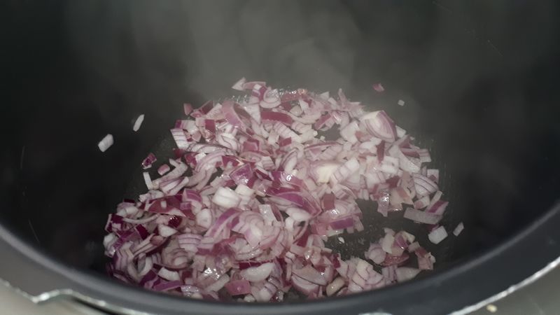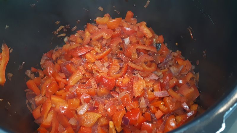 - Mettre votre Cookéo en mode dorer, dès le début du préchauffage verser l’huile et les oignons, mélanger et laisser dorer tout le temps du préchauffage, ajouter les poivrons, mélanger et laisser dorer 15 minutes en mélangeant régulièrement.