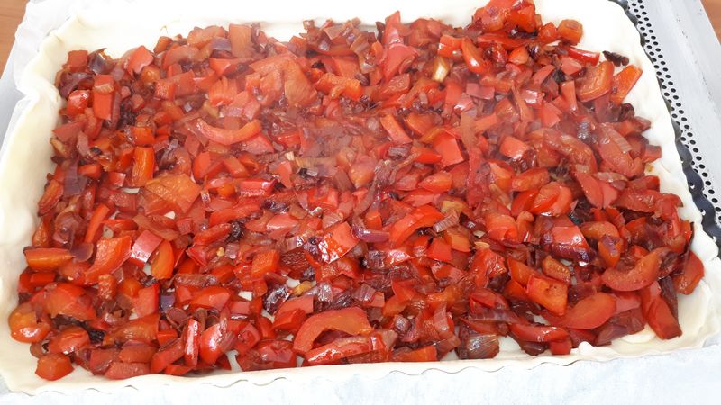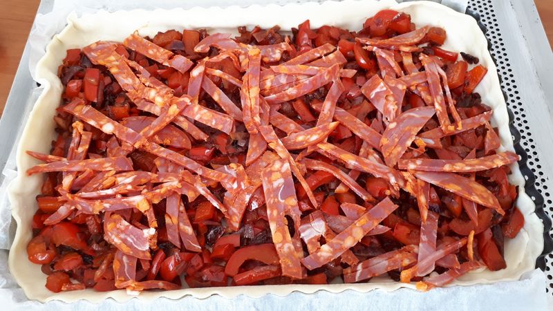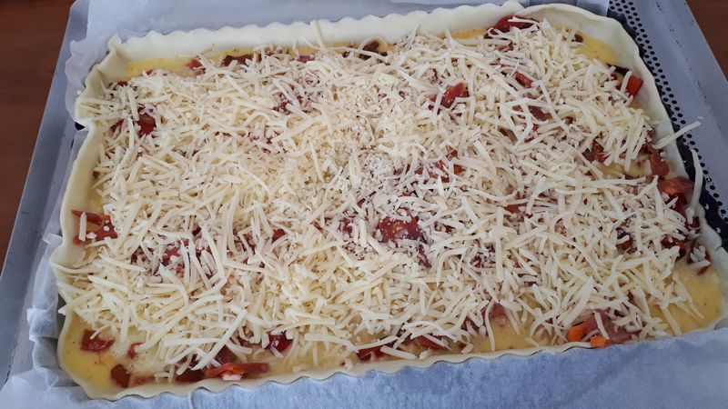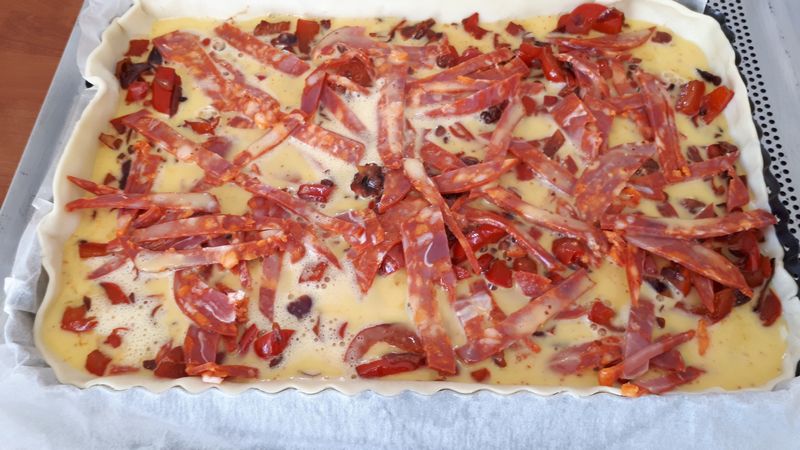 - Lorsque les poivrons sont fondants les mettre sur la pâte, parsemer de lanière de chorizo, puis verser l’appareil et mettre votre emmental râpé.