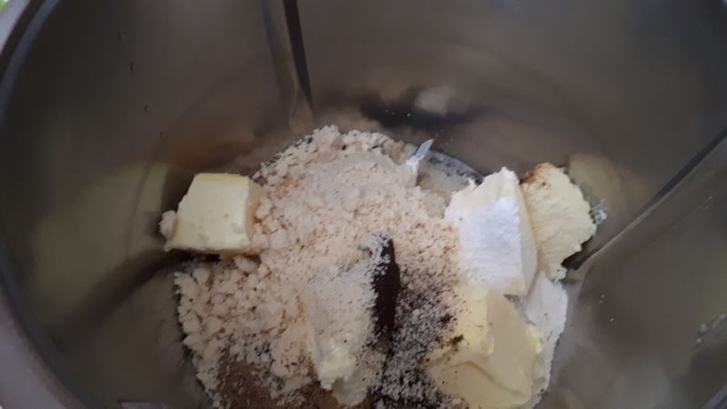 - Dans votre bol, mettre la farine, le sucre, la poudre de vanille, la levure chimique,la poudre de noisettes, le beurre coupé en morceaux, l’oeuf et mélanger 30sec/vit6.